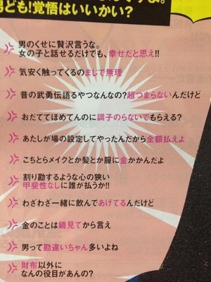 - ↑ 번역하면 다음과 같다; 1. 남자 주제에 주제넘는 말은 하지 마. 여자랑 얘기하는 것만으로 행복한줄 알아! 2. 가볍게 들이대는 건 정말로 무리 3. 옛날 무용담 늘어놓는 녀석 말이야? 진짜 별볼일 없는데 4. 치켜세워 줬다고 잘난척 하지 말아줄래? 5. 내가 자리 잡아줬으니까 전부 네가 내 6. 우린 화장하고 머리하고 옷입는데도 돈이 든다구 7. 더치페이하는 쪼잔하고 찌질한 녀석한테 누가 돈을 내줄까! 8. 일부러 같이 마셔주는 건데 9. 돈은 거울보고 말해 10. 남자는 착각쟁이들 뿐이야 11. 지갑 이외에 무슨 역할이 있지?