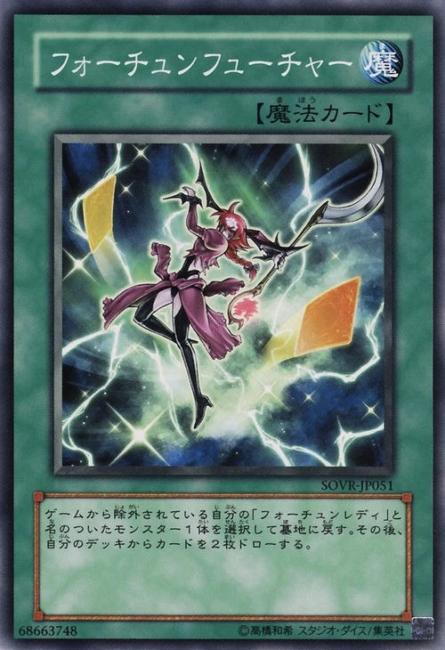 포츈 레이디의 존재 이유라고도 할 수 있는 전용 드로우 카드. 사실상 이 카드 때문에 포츈 레이디의 연구가 계속 진행되고 있다 해도 과언이 아니다. 능동적으로 제외해 드로우를 노리자. 퓨처 비전 + 라이티 콤보뒤 사용해도 좋고, 필드에 남기는 의의가 적은 파이리를 제외해 드로우하는 것도 좋다. 퓨처 비전 이외에는 아공간 물질전송장치, 이차원 격리 장치 등이 쓸만하다.