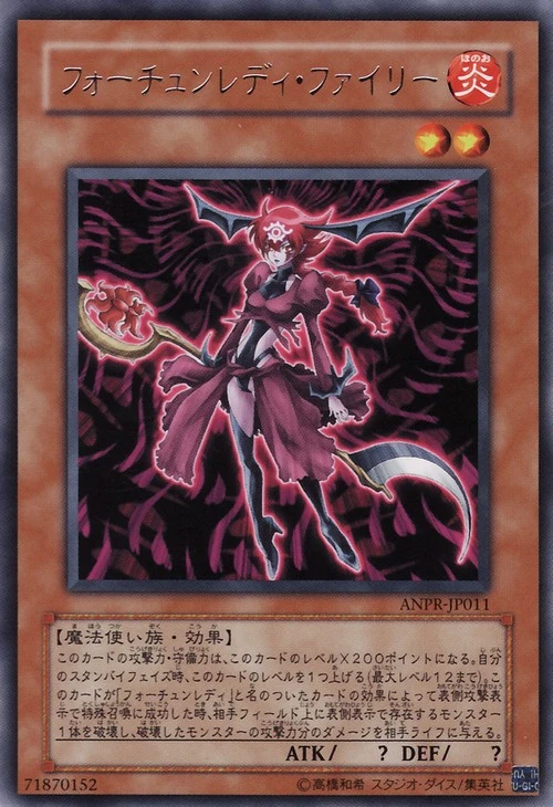 이 카드의 공격력 / 수비력은 이 카드의 레벨 × 200포인트가 된다. 자신의 스텐바이 페이즈시, 이 카드의 레벨을 1개 올린다(최대 레벨 12까지). "포츈 레이디" 라는 이름이 붙은 카드의 효과에 의해서 앞면 공격 표시로 특수 소환에 성공했을 때, 상대 필드 위에 앞면 표시로 존재하는 몬스터 1장을 파괴하고, 파괴한 몬스터의 공격력만큼 데미지를 상대 라이프에 준다.