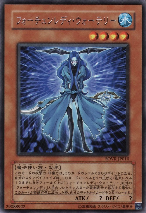 이 카드의 공격력 / 수비력은 이 카드의 레벨 × 300포인트가 된다. 자신의 스텐바이 페이즈시, 이 카드의 레벨을 1개 올린다(최대 레벨 12까지). 자신 필드 위에 "포츈 레이디 워테리" 이외의 "포츈 레이디" 라는 이름이 붙은 몬스터가 앞면 표시로 존재할 경우에 이 카드가 특수 소환에 성공했을 때, 자신의 덱에서 카드를 2장 드로우한다.