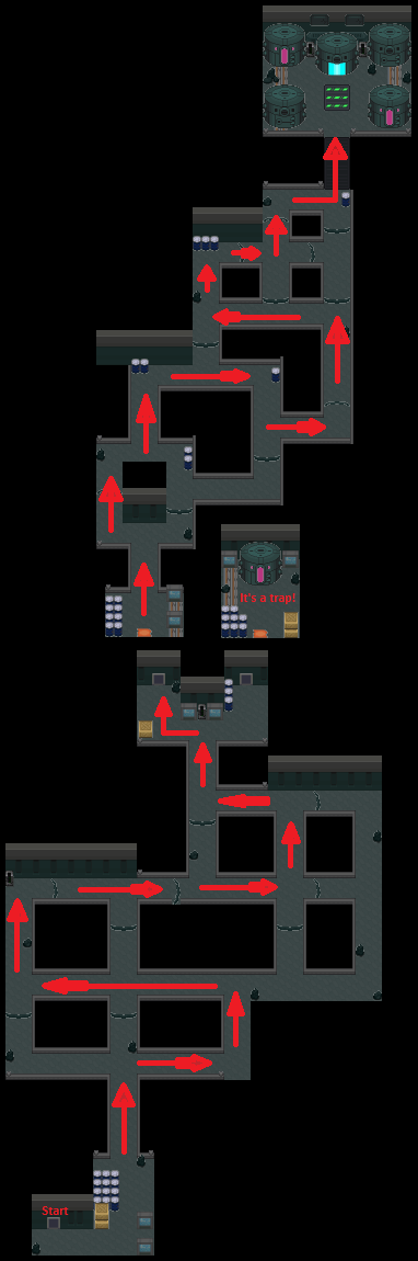 서쪽 맨 끝 방에 들어가서 레버를 초록, 빨강, 파랑 순서로 당긴후 오른쪽의 회색 레버를 당기면 전력이 돌아온다. 처음 깨어난 방의 포켓몬 회복기계를 쓸 수 있다. 이제 가운데의 유리문으로 들어가면 된다. Hazard Suit의 Power cell을 찾으려면 유리문에서 나와 오른쪽의 건물로 향한다. 건물 깊숙히 들어갈 수록 포켓몬 조우 확률이 높아지고 진행중 75레벨의 Trawpint 3마리와 싸우게 되니 주의. 잡아도 된다. 3마리와 배틀 후에 Power cell을 얻을 수 있다. 또, 진행 도중 순수 핵타입 포켓몬 Xenogen이 나타난다. Hazard Suit의 파워가 회복 되었기 때문에 바깥의 바위를 괴력없이 밀 수 있다.