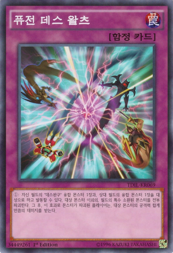 | ① : 필드의 융합 몬스터 2장을 대상으로 하고 발동한다. 대상의 몬스터들의 공격력의 합 이하의 필드의 융합 몬스터 이외의 특수 소환된 몬스터를 전부 파괴하고, 그 합한 수치 만큼의 데미지를 파괴된 몬스터의 컨트롤러에게 준다. | ||||