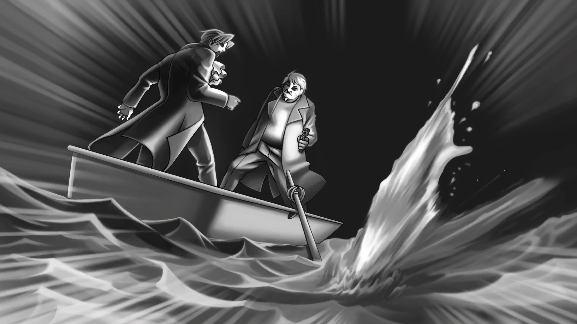 그리고 늦은 시각 미츠루기를 보트 위로 불러 나마쿠라로 변장한다. 보트 위에서 하이네는 미츠루기를 살짝 피하도록 총 두 발을 쏴서 다른 사람이 목격하게 만들었고, 스스로 호수에 뛰어들어 수영을 해서 보트관리실로 돌아왔다. 그리고 나마쿠라의 시체를 호수 밑으로 던졌다. 멀리 있는 사람이 보게 되면 보트 위에 두 명이 있는데 총성이 들렸고 한 명이 보트에서 떨어진 것, 그리고 진짜로 나마쿠라의 시체가 호수 바닥에서 발견된 것으로 추정하여 미츠루기가 나마쿠라를 살해했다고 생각하게 되는 것이다. 그리고 실제로 미츠루기가 체포되었다.
