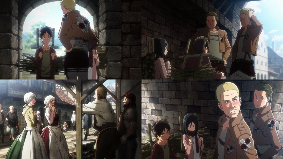 하지만 결국 미카사와 엘런을 살리기 위해 엘런의 어머니를 버리게 되었고, 엄마를 구하지 못했다고 원망하는 엘런에게 거듭 사과했다.