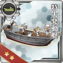 | 일본군 육군에서 개발한 병력 및 물자 수송용 상륙정.일본 위키 링크 장착한 함선을 원정에 보낼 시 자원 5%를 더 입수할 수 있는 기능과 육상형 적에게 추가 피해를 줄 수 있는 기능이 있다. 현재 입수방법은 육군제 강습상륙함인 아키츠마루를 건조하는 방법과 아부쿠마를 2차 개장 시키는 것. 아키츠마루 이외에는 한정된 함선들에게 장비 가능하다. 이 장비의 효과로 늘어나는 입수자원 상승률은 한번의 원정에 +20%가 한계. 즉 최대 4개까지만 중첩돼서 적용된다. 이때 원정 대성공(x1.5)과 합쳐 최대 기본보상의 1.8배까지 보상을 받을 수 있다. 등장 초기부터 선박의 전후가 반전되어 그려져 있던 고증오류가 있었으나 2015년 11월 18일 패치로 수정되었다. 예전 이미지. 일러스트에서 짐이 실려있는 뒷부분이 실제로는 상륙용 내림판이 달려있는 배의 앞부분이고, 앞쪽처럼 그려진 부분은 엔진이 있는 뒤쪽이므로 스크류가 달려있어야 했다. | ||||||||||||||||||||||||||||||||||||||||||||||||||||||||||||||||||||||||||||||||||||||||||||||||||||