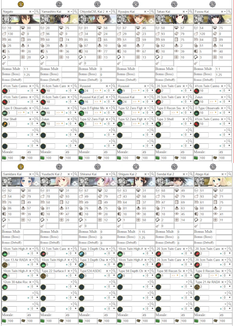 - 야간전 장비 : 조명탄은 확실히 도움이 되고, 탐조등은 도움도 되지만 방해도 된다. 도중 야간전방이 있는 해역에서 탐조등을 장착할 경우 상대의 컷인 확률을 더 낮출 수 있고 기함에 탐조등을 장착하면 기함보호로 공격이 몰릴 가능성을 조금 낮춰 줄 수 있지만 동시에 기함이 대파당할 가능성도 높기 때문. 야간정찰기는 애매한데, 도중 야간전방에서는 야간접촉이 가능하겠지만 보스방은 야간전으로 시작하고 주간전으로 가봤자 제공권을 딸 수 없다. 그러나 일부러 도중 야간전방에서의 디메리트를 감수하고 항모를 끌고 가서 공략에 성공한 경우도 있었기 때문에 어떻게 될 지는 알 수 없다.
