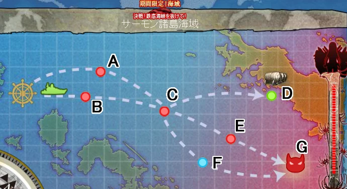 맵 분기표는 일직선으로만 가다 보스전 앞에서 보스 직통 혹은 꽝이라는 매우 단순한 구성인데, 이 이벤트에서만 유일하게 최종맵인 E-4 적 정박지 강습 이외의 E-1~3 해역은 돌파하면 그 시점에서 재출격이 불가능했다. 이때는 이벤트 해역 전용 드랍이 없었기에 망정이지 전용 드랍이 있는 최근의 이벤트에서 적용했다면 상당히 문제가 되었을 시스템.