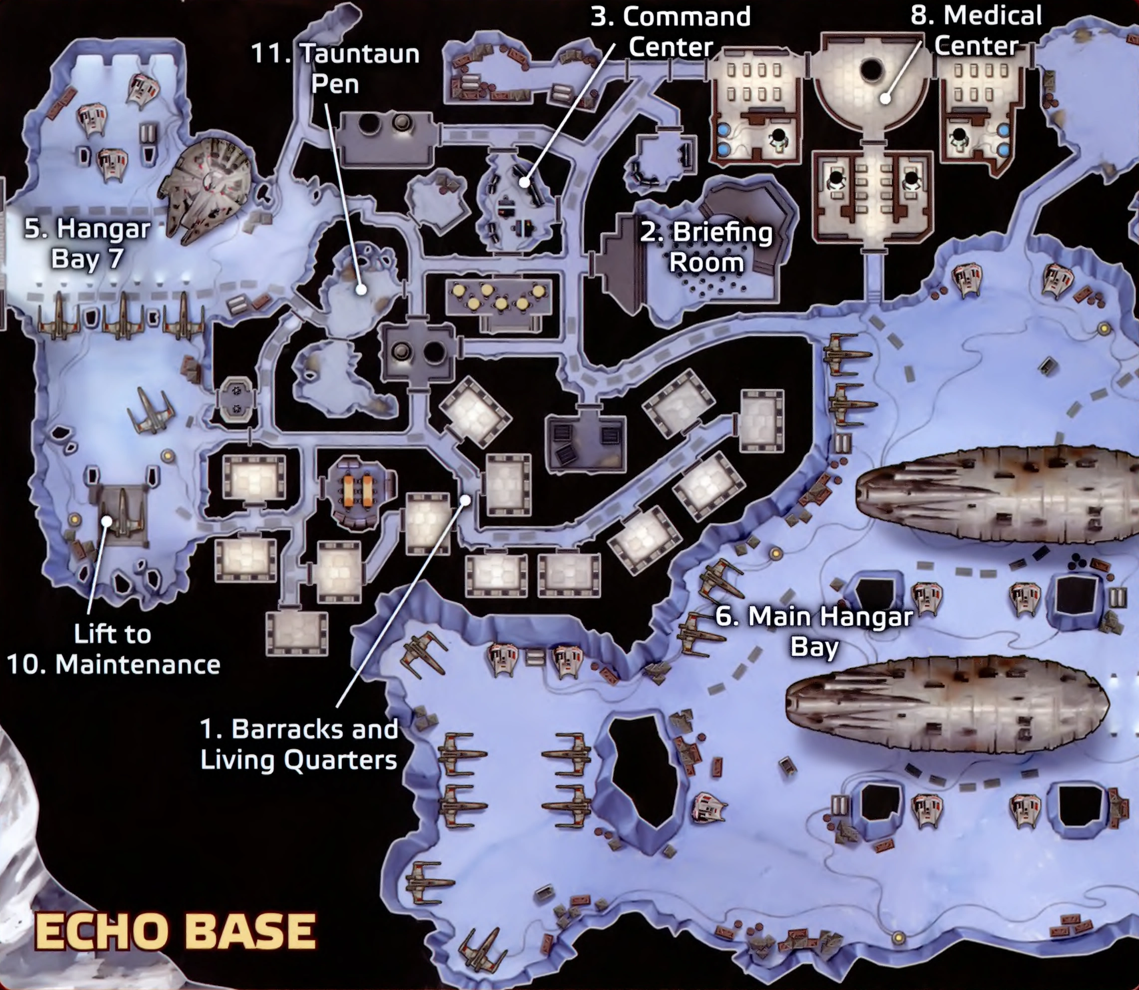 - 에코기지 3-T-8 : 기지 밖 멀리 위치한 경계근무소. 약간의 보병, 참호, DF.9 대보병 포대와 1.4 FD P-타워가 몇 배치되었다. 호스 전투에서 최초로 AT-AT를 발견하고 보고 후 교전한 곳으로, 금방 털려서 후퇴한다.