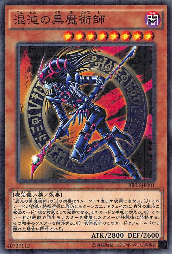 | "혼돈의 흑마술사"의 ①의 효과는 1턴에 1번밖에 사용할 수 없다. ①: 이 카드가 일반 소환 / 특수 소환에 성공한 턴의 엔드 페이즈에, 자신 묘지의 마법 카드 1장을 대상으로 하고 발동할 수 있다. 그 카드를 패에 넣는다. ②: 이 카드가 전투로 상대 몬스터를 파괴한 데미지 계산 후에 발동한다. 그 상대 몬스터를 제외한다. ③: 앞면 표시의 이 카드는 필드를 벗어났을 경우에 제외된다. | |||||