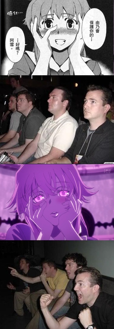 애니메이션 미래일기 1화의 마지막에 나온 명장면과 이 장면을 패러디한 짤방들을 가리키는 말.