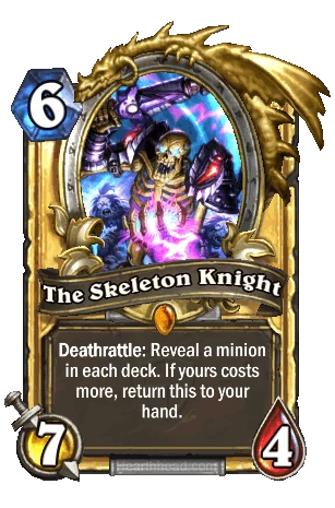 대 마상시합 공용 전설 카드. 용사의 시험장 3네임드로 등장하는 흑기사의 2페이즈다. 전설 카드 치고는 이름이 일반~영웅 등급에서 쓰이는 카드 같은데, 이름 없는 잡졸 해골기사가 아니고 이미 전설 카드로 등장한 적이 있는 흑기사가 1페이즈에서 유저들에게 패배 후 해골로 되살아나서 다시 유저들과 싸우는 2페이즈의 모습이다. 그래서 그냥 Skeleton Knight가 아닌 The Skeleton Knight다. 원작의 흑기사의 패턴이 흑기사→해골기사→망령기사 이므로 이후에 망령기사 카드가 나올 수 있을 듯. 이와 별개로 낙스라마스의 저주에서 우두머리 전용 카드로 동명의 카드가 나온 적이 있지만 영어 명칭은 다르다.