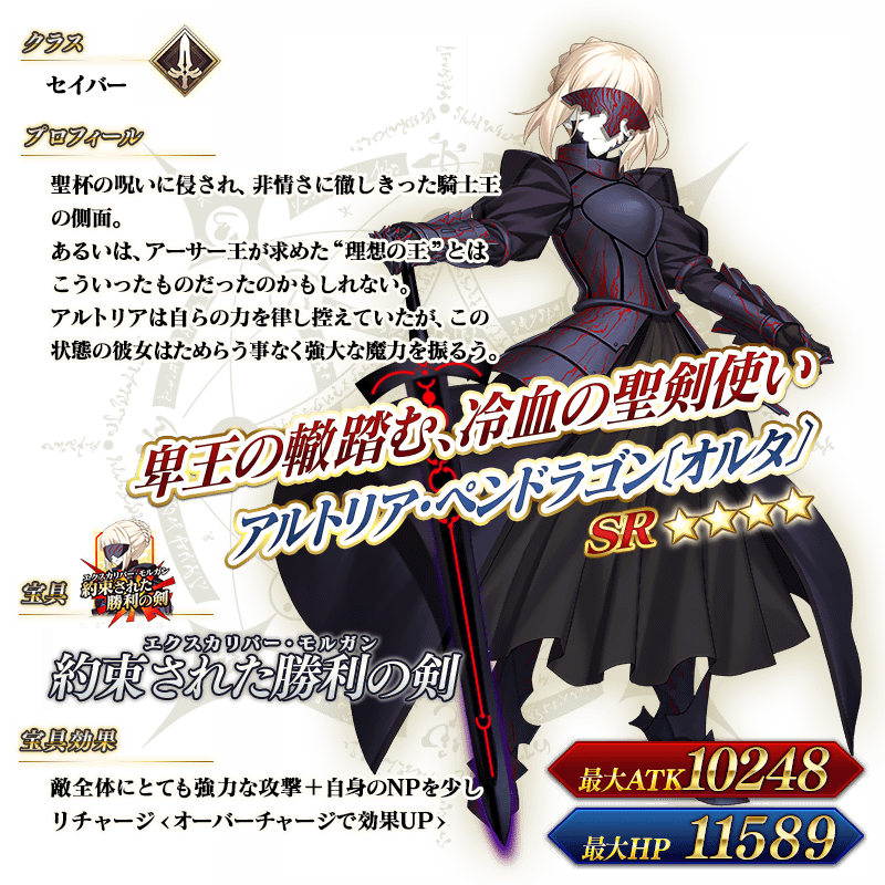 그리고 유일하다면 유일하게 세이버 얼터가 페스나에서 스탯이 나와있는지라, 서번트 카드로 나온 흑화 영령의 원본보다 1랭크 스탯 저하가 본편의 흑화 후의 스탯을 기준으로 저하인지 흑화되지 않은 정순한 상태를 기준으로 저하인지는 확인불가. 물론 일단은 평범한 세이버에서 1랭크 저하된 것이 다른 서번트들과 형평성이 맞을 것이다.