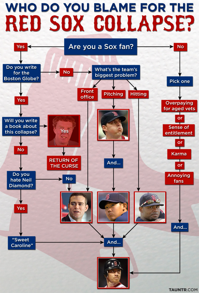 | 도대체 보스턴에서 누구를 원망해야 할까? 표. 다른 인물들은 투수의 존 래키와 마쓰자카 다이스케, 오피스에서 GM 테오 엡스타인, 타격에서는 칼 크로포드. 왼쪽 빨간 색으로 덧칠해진 인물은 |