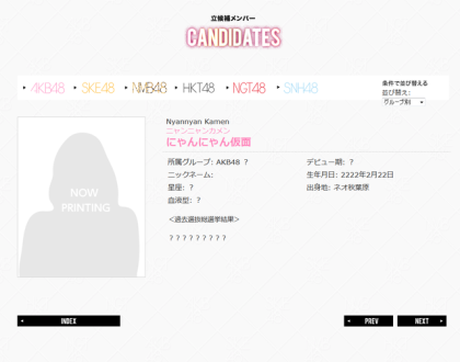 2222년 2월 22일 출생에 네오 아키하바라 출신, 나머지 프로필은 전부 물음표. 그리고 입후보명에 "냥냥 가면"이라 적혀 있어 혹시 작년 불출마한 코지마 하루나가 올해 입후보하는 것이 아니냐는 기대가 있었지만 결국 입후보하지 않았다.