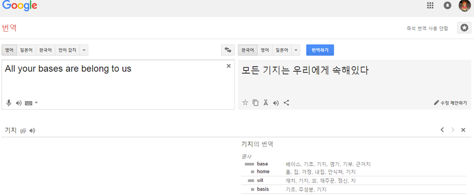 All my heart are belong to you. - 결국 어떻게든 원래 쓰려고 했던 문장을 복원해보자면 All of your bases belong to us 정도일텐데, 원래 문장을 최대한 유지할 때나 그렇다는 거고, 실제로는 문어적 표현에 가깝다. 한국어로 따진다면 "네 기지들은 전부 우리에게 속해있다" 정도.[1] 매끄러운 문장으로 만들어주려면 '속한다'를 적절한 단어로 바꿔 주어야 한다. 이하는 변경 후보 문장들과 한계점.