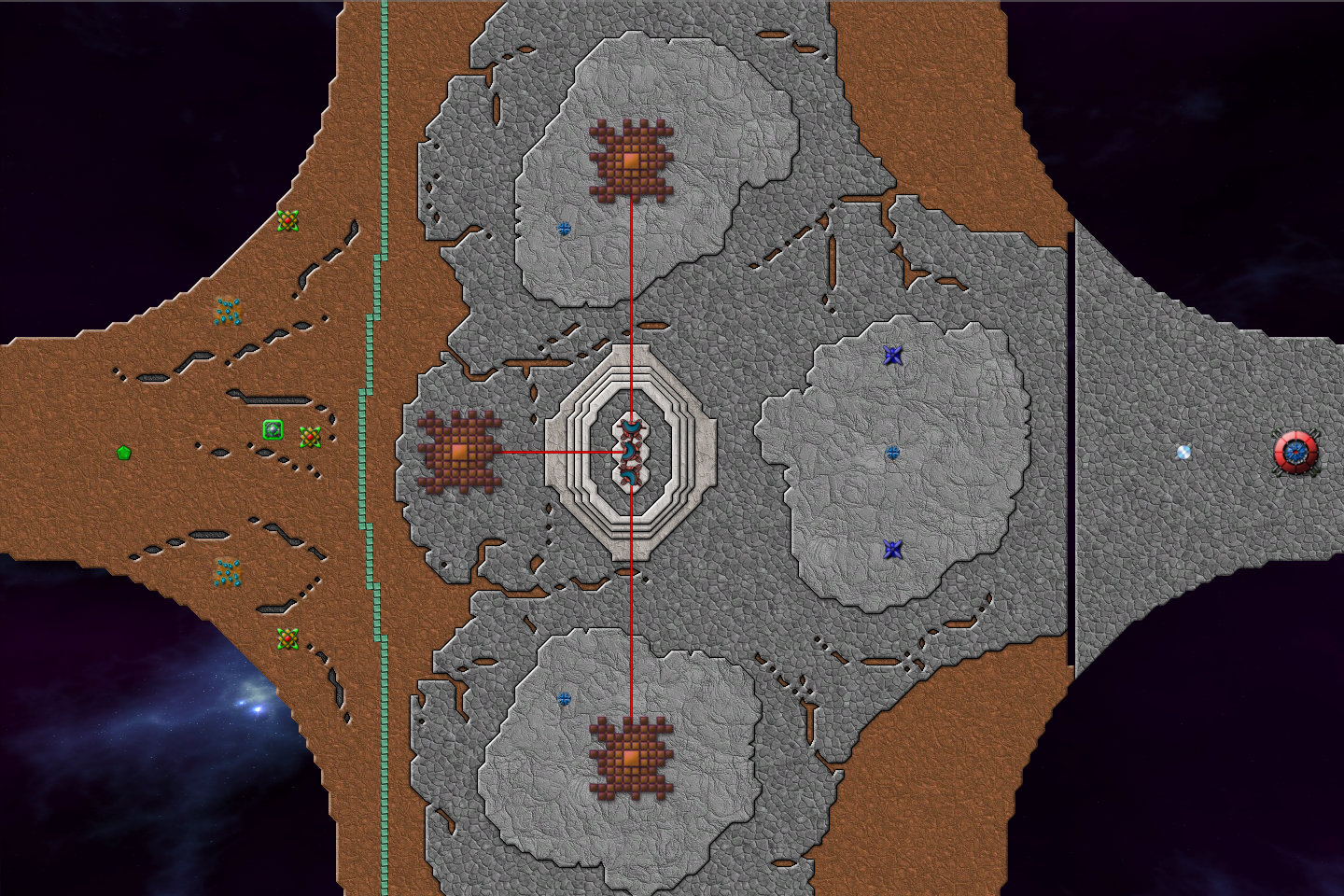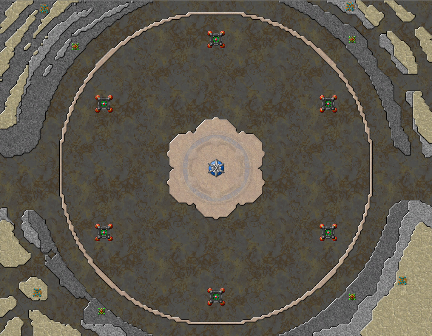 또한 성문 사수를 잘 해야 한다. 이 맵에는 총 8개의 성문이 있다. 중성자 별이 반대쪽에 있을때 이 성문을 사수 하지 못하면 위에서 말한것과 같은 사태가 벌어질 수 있다. 테라포머로 막아 버리는 방법도 있으니 참고 바란다.