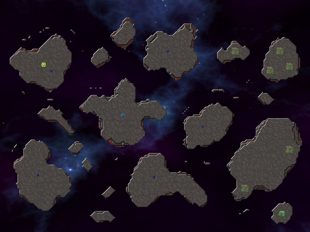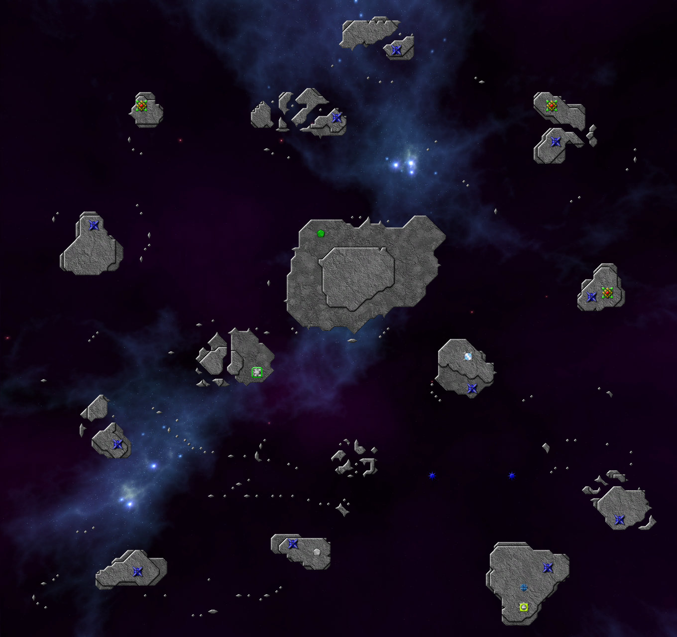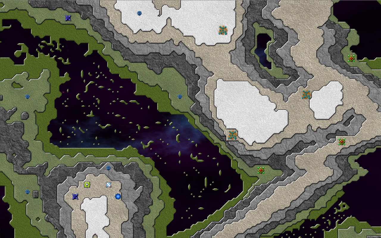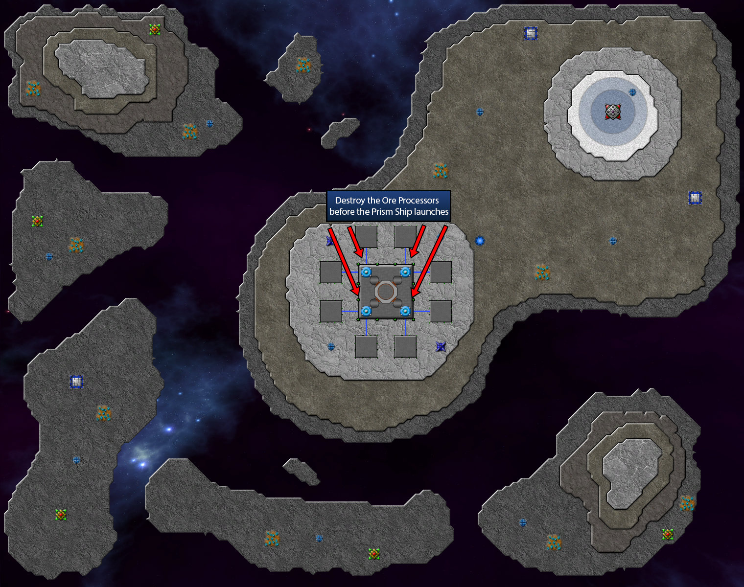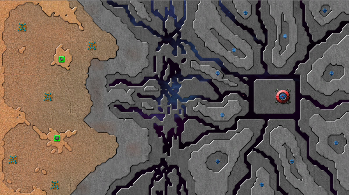 오른쪽 하단 대륙에 커맨드를 착륙시키길 권장한다. 이 맵에서 Bomber를 얻을 수 있으며, 총 6개의 광물 지대가 있다. 각 섬에 있는 작은 Emitter들은 Nullifier로 파괴할 수 없으며, 중앙 Emitter를 파괴하면 자동으로 사라진다. 한 섬을 장악했다 하더라도 작은 Emitter에서 크립이 계속 나오니, 공세를 늦추지 않는 게 중요하다.