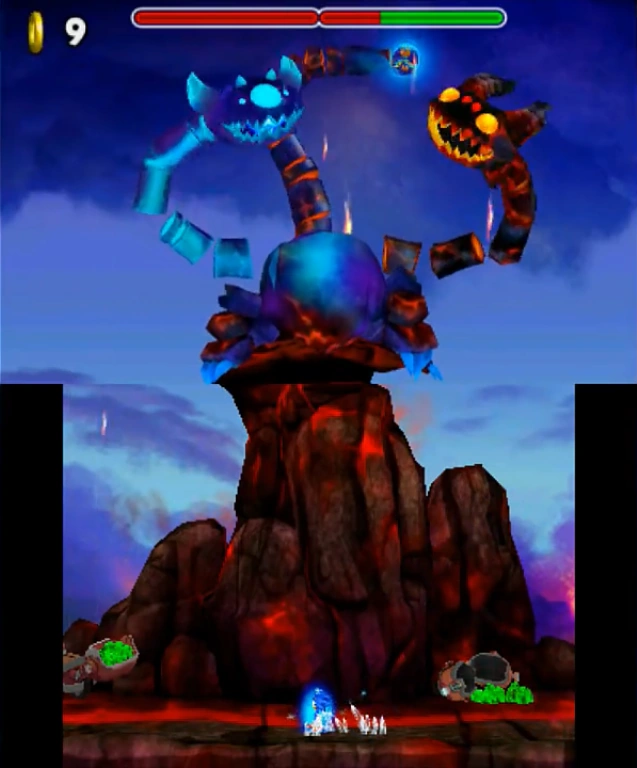 보스전에서는 다른 스테이지와 달리 닌텐도 3DS의 두 화면을 동시에 사용하며, 팀 소닉에 속한 다섯 명의 플레이어블 캐릭터 중 지정된 두 명을 조작하게 된다. 이 때 캐릭터의 교체 타이밍은 플레이어가 직접 정할 수 없으며, 상황에 따라 자동으로 교체가 이루어진다.