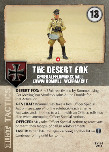 아아... 그분이 오셨어요!! 모두다 알다싶이 롬멜 원수가 나왔다. 능력도 지휘관 스킬이 붙어서 명령을 내릴 때 일반 지휘관은 주사위 한개를 굴리는데 반해 이 분은 2개를 굴려서 확률을 높인다. 따라서 유동적이고 날카로운 유닛 운영을 가능하게 해준다.