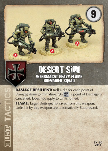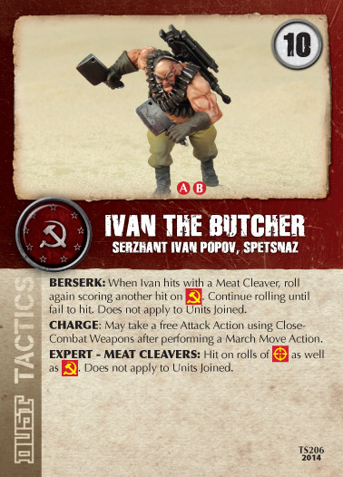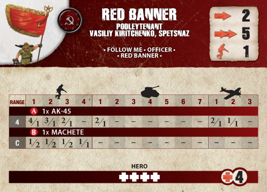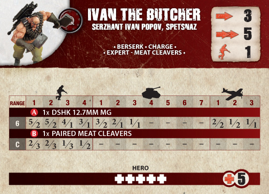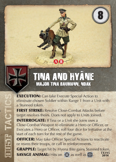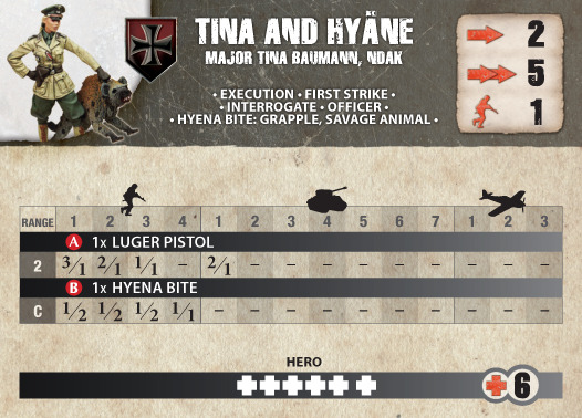 근접전에 좋은 영웅이지만 추축군의 유닛들 대부분이 사거리전을 선호하기 때문에 활용하기 쉽지 않지만 높은 체력 덕택에 그냥 몸빵용으로 세울 수도 있다. 문제는 처형스킬이 있다는 점 마치 커미사르 처럼 스턴에 빠진 분대의 보병 하나를 죽임으로 써 스턴에서 회복시키는 무시무시한 기술이다.
