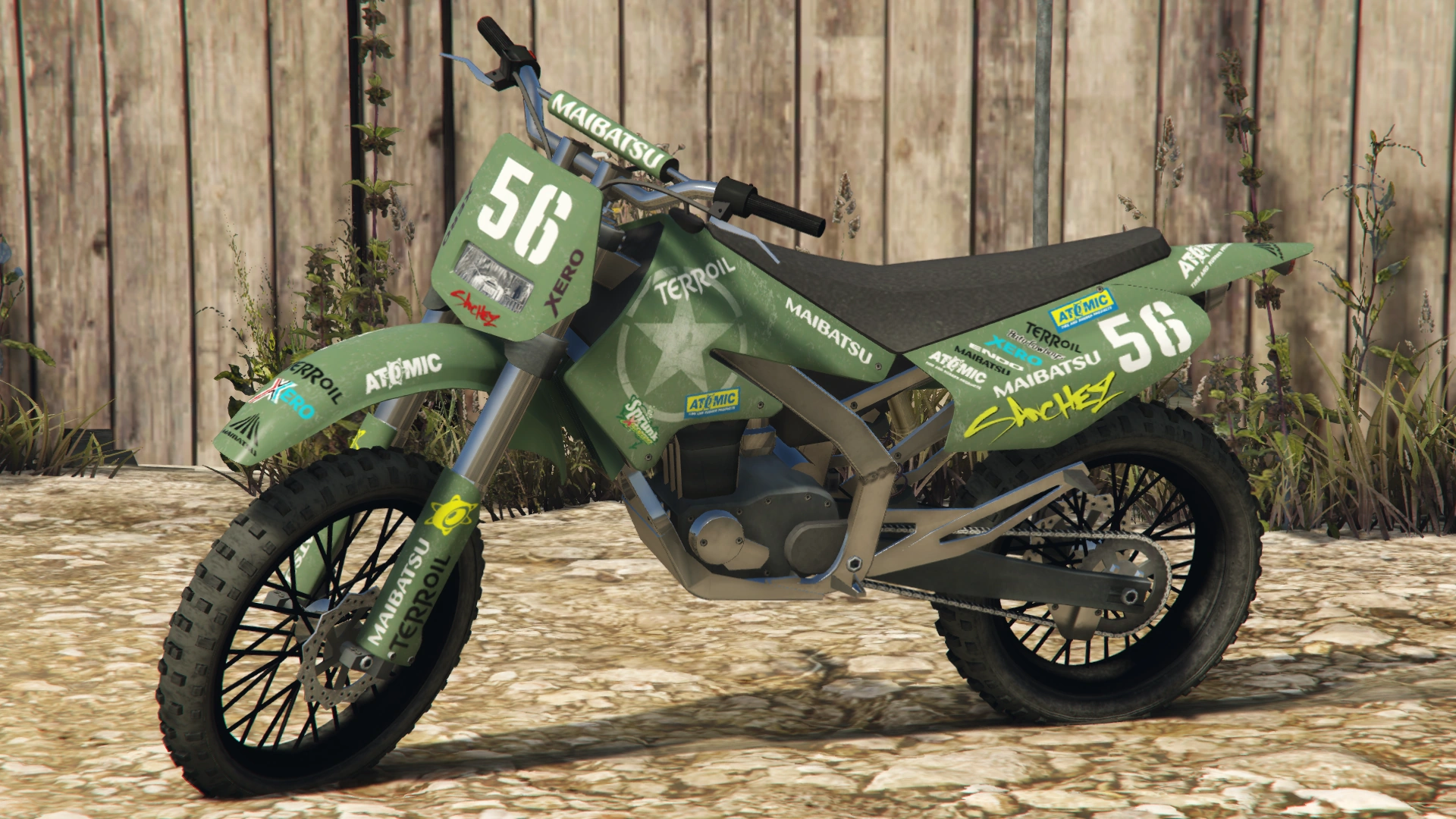 참고로 휠을 교체할 수 없고 방탄 타이어와 타이여 연기만 교체할 수 있다. 이전에는 휠도 교체할 수 있었지만 교체하면 울퉁불퉁한 오프로드 타이어가 매끈한 일반 타이어로 바뀌는 통에 산악용 바이크라는 특성상 엄청 어울리지 않았는지 락스타 측에서 아예 빼버렸다. 이는 엔듀로도 마찬가지.