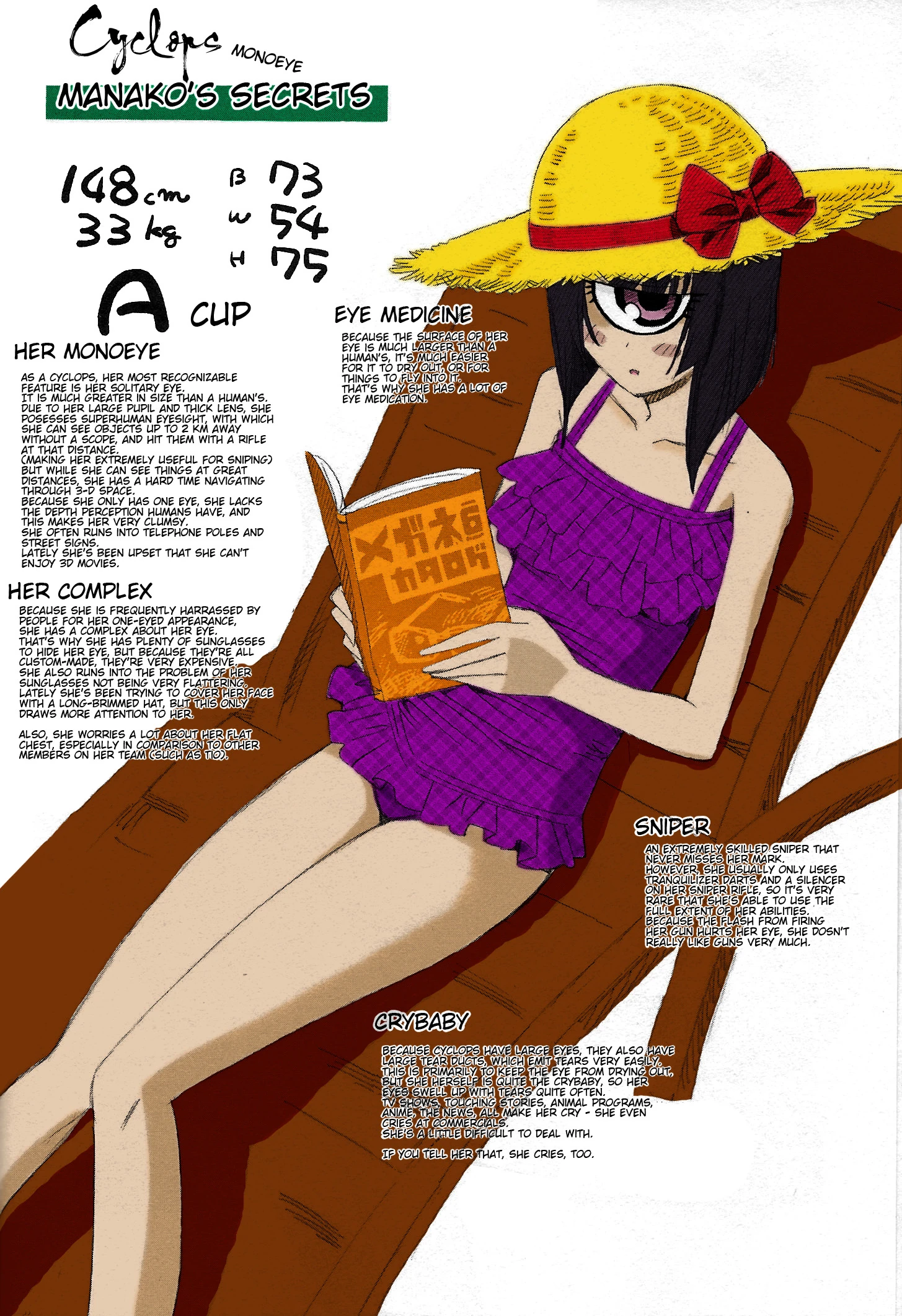 MON의 저격 담당. 독안족(獨眼族) 소녀.[10] 얼굴 한가운데에 엄청나게 큰 눈이 있으며[11], 이렇게 눈이 큰 것으로 인한 장점이 있는 반면 단점이 꽤 만만치 않다. 눈이 큰 만큼 잘 마르고 티끌도 잘 들어가서 안약을 많이 들고 다녀야 한다고, 스나이퍼이지만 주로 사용하는건 마취탄이고 실탄을 사용할 때 나오는 총구 화염[12]은 눈을 따갑게 만드는 탓에 총 자체를 별로 안 좋아하지만 그런데도 포지션이 저격수야? 그 솜씨는 스코프 없이 2km 밖에서 빌딩 바람으로 흔들릴 탄도까지 계산해가며 상대가 든 소총만을 정확하게 노려 파괴할 수준. 눈이 하나 밖에 없어 원근감이 없기 때문에 기둥이나 장대같은데 잘 부딪혀서 길거리를 돌아다니기 힘들어한다. 거기다 입체감을 느끼지 못하니 당연히 3D 영화를 볼 수 없어서 섭섭해 하고 시력 검사는 아예 하지도 못한다. 저격수인 고로 자기 키보다 큰 저격소총을 주로 사용하지만 경호 임무를 맡을땐 서류가방으로 위장할 수 있는 FMG와 유사한 가변 소총을 사용하기도 한다.[13]
