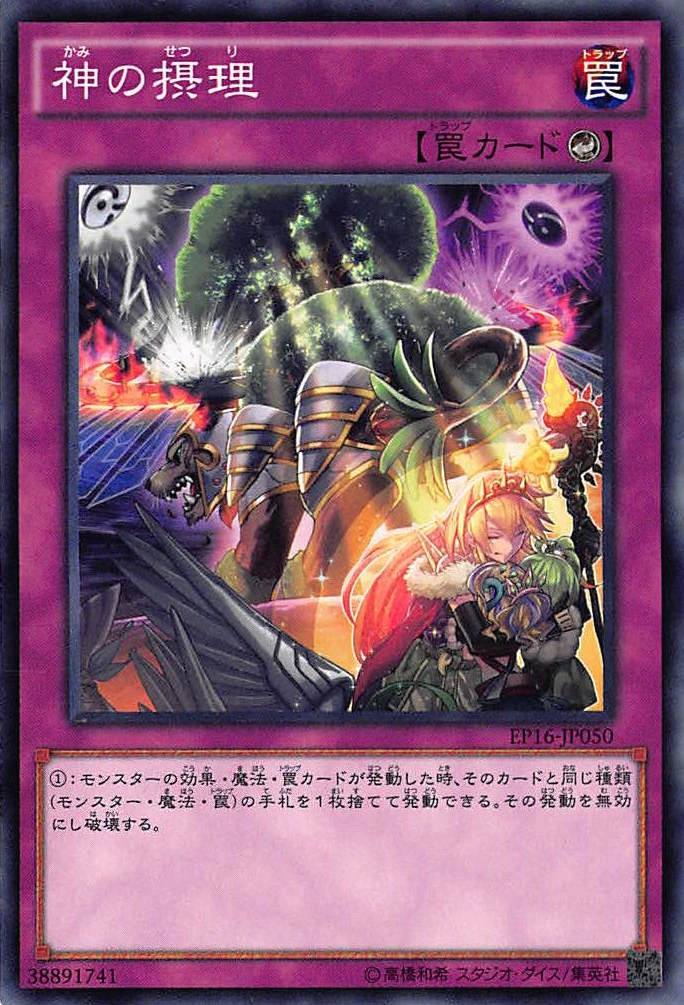 TCG 브레이커즈 오브 섀도우의 월드 프리미어 카드. 특정 패 코스트로 모든 종류의 카드 효과를 막을 수 있다. 아리아드네와 함께라면 노코스트 발동이 가능하니 퍼미션 덱이라면 추천되는 카드. 다만 신의 충고처럼 몬스터의 소환을 무효로 하지는 않으니 주의.